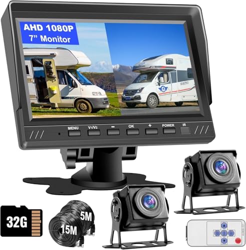 - ►【AHD 1080P Monitor with 2-channel & Split Screen Function】Backup camera has 7" super large AHD 1080P screen. Digital High definition Image Processor would offer Vivid picture with true color help us drive the car safely. Stable wired signal, no delays. The monitor of rv camera system wireless has 2 channels, and you can add 2 cameras to the front, rear simultaneously to eliminate blind spots. At the same time, the monitor of back up camera for truck rv system supports full-screen/split-screen.