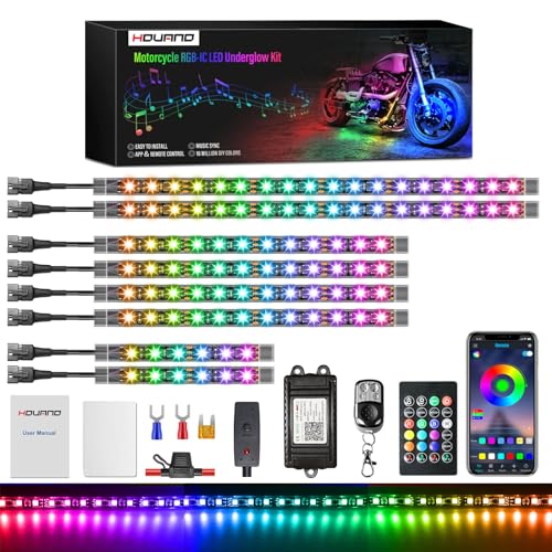 - 【New Design & Magic-RGB LED Light】 We this Magic-RGB motorcycle led light kits, with brake light warning function and turn signal function. Supporting multiple RGB static colors, and 256 dream chasing mode, such as chasing, running, flowing, jumping, and more, creating an enchanting spectacle as if the lights are chasing each other.motorcycle LED light strips uses high brightness SMD5050 RGB LED SMD beads and fully sealed potting technology, very bright and IP68 waterproof.The convenient on/off